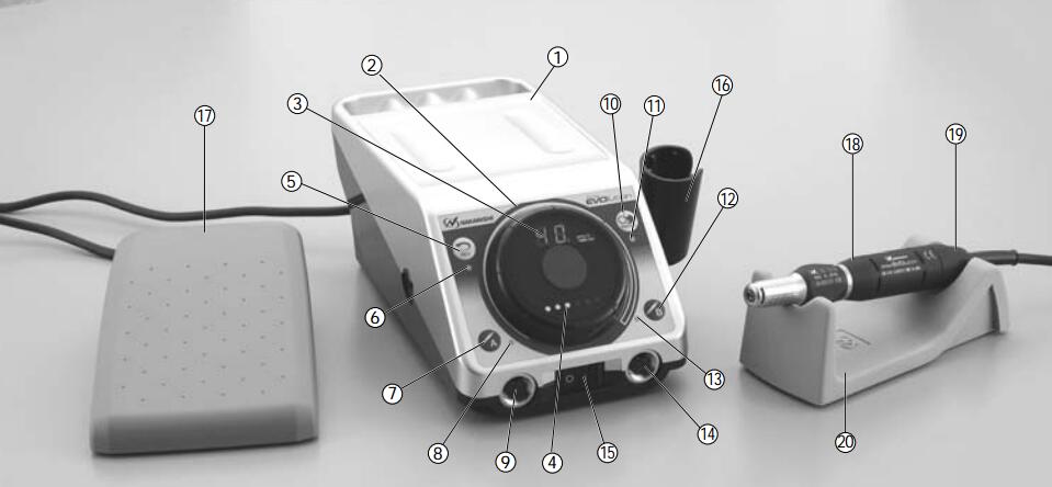 1.機體電源 2.轉速調整盤 3.轉速顯示 4.LED 負荷顯示燈 5.反轉按鍵 6.反轉LED 顯示燈 7.開關按鍵A 8.打磨筆A 啟動LED 顯示燈 9.打磨筆連接插口A 10.轉速固定 11.轉速固定LED 顯示燈 12.開關按鍵B 13.打磨筆A 啟動LED 顯示燈B 14.打磨筆連接插口B 15.電源開關 16.打磨筆放置插架 17.腳踏開關(選配) 18.打磨筆 19.按鍵開關 20.打磨筆放置架 |