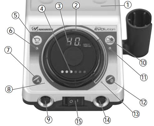 ①機體電源 ②轉速調整盤,用來調整打磨筆轉速。 ③轉速顯示,轉速是以1000 為單位,(如顯示是40, 表示當前轉速為40000 轉/min-) ④LED 負荷顯示燈??偣灿? 個LED 顯示燈,3 綠2 橙1 紅。紅色表示在允許范圍內,橙色表示過 載,紅色表示過載即將斷開運行。 ⑤反轉按鍵 ⑥當LED 燈亮起時,表示當前狀態(tài)處于反轉運行。 ⑦啟動按鍵A,連接打磨筆可以按此鍵啟動。 ⑧當LED 燈亮起時,表示當前處于運行狀態(tài)。 ⑨連接插口,連接打磨筆。 ⑩FIXPEED 按鍵是速度固定,有些打磨頭轉速不能過高,可以長按FIXPEED 按鍵將轉速固 定在允許范圍內,以保證使用安全。如需要取消轉速,先將打磨筆處于停止狀態(tài),按FIXPEED 鍵取消,將轉速調至所需轉速在啟動。(FIXPEED 設置最高30000min-) 11.當FIXPEED LED 燈亮起時,表示當前轉速已固定。相反,當FIXPEED LED 熄滅時, 表示固定轉速已經(jīng)取消。 12.啟動按鍵B,連接打磨筆可以按此鍵啟動。 13.當LED 燈亮起時,表示當前處于運行狀態(tài)。 14.連接插口,連接打磨筆。 15.電源總開關,打磨機停止運行可以按此鍵將電源斷開。 |