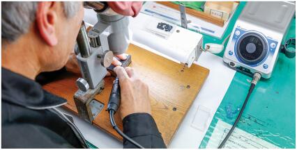 小的唱片針,最大的有45個零件組成,針尖是米粒小,肉眼看不到,因此用顯微鏡放大鏡等作業(yè)。記錄針懸臂的修理,使用的是中西NAKANISHI研磨機(jī)E-MAX系列,常用的套裝是EV410-230.