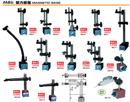 應用:日本KANETEC強力公司專業(yè)生產(chǎn)的MB系列磁性基座機床或鐵平板上,主要對機械加工工件等的尺寸進行比較測量時,如果是以千分尺方式的測量器等進行測量(用以檢測誤差、偏差),本儀器作為測量器夾具得到廣泛使用。