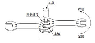 2,在夾頭螺母上套上附帶的14mm扳手朝逆時針方向轉(zhuǎn)動,夾頭松動后取下工具。(轉(zhuǎn)動約1圈夾頭螺母可緊固1次,再次轉(zhuǎn)動后夾頭被打開。)
