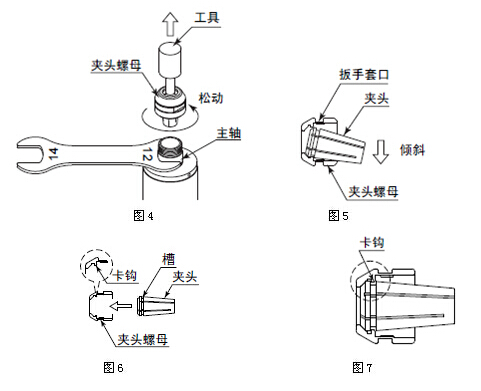 此時,確認夾頭槽是否準(zhǔn)確地進入了夾頭螺母的卡鉤(圖- 7)。
