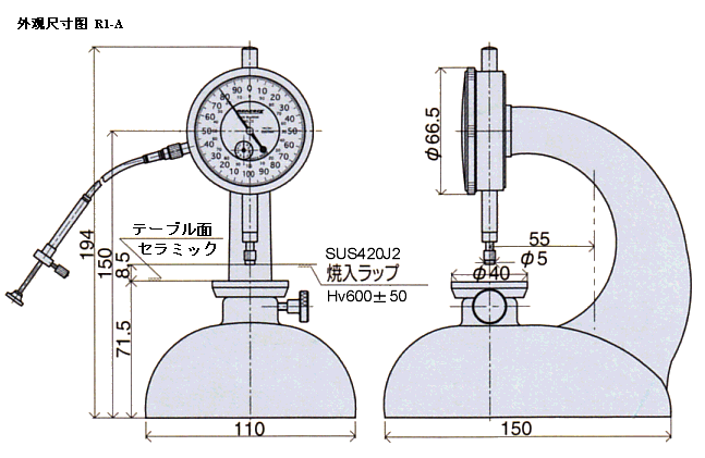 型 號 | 標準參數 | 指示誤差 (um) | 測定臺直徑 (mm) | 測頭直徑 (mm) | 測定力 | 測量深度 (mm) | 有效測定范圍 (mm) | 高度 (mm) | ||