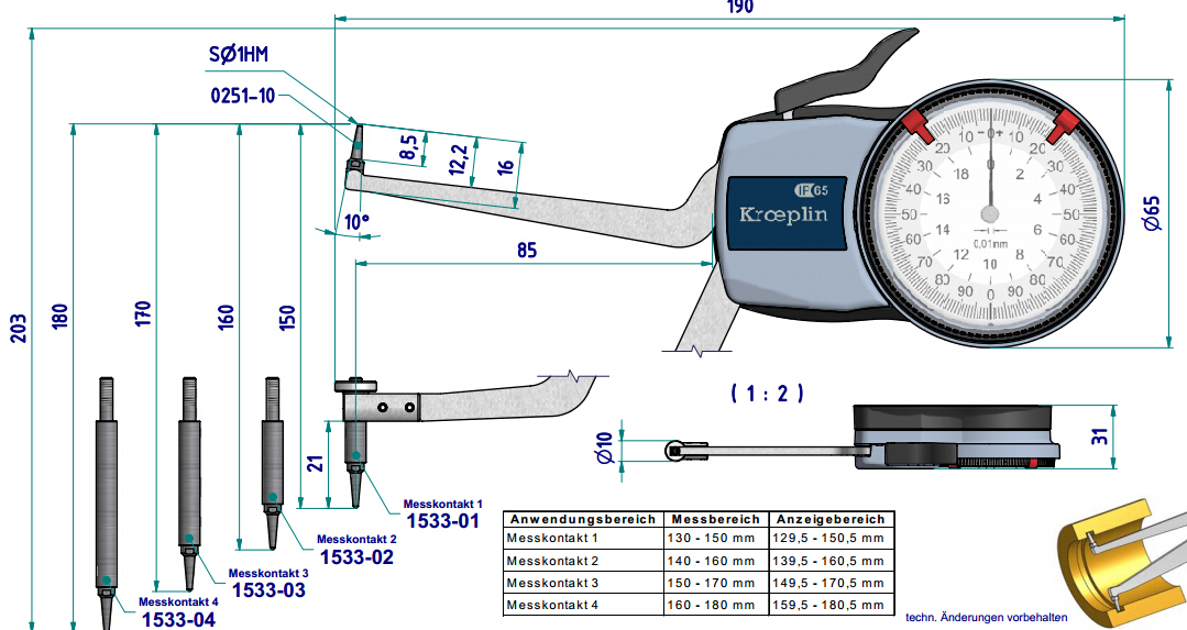 • 德國kroeplin針盤式內(nèi)卡規(guī)H2M130,測(cè)量范圍:130-180mm,精度0.01mm,喉深長度:85mm。
