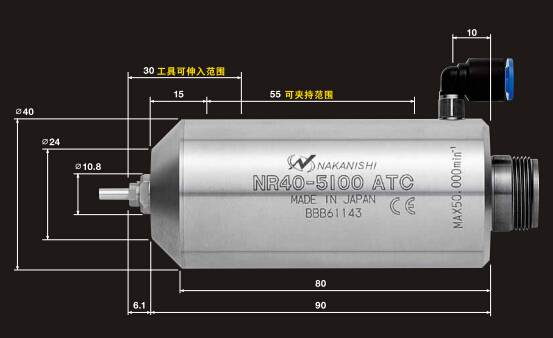 NR40-5100 ATC | Φ40mm | 50000min-1 | 2μm以內(nèi) | 夾頭(CHB系列) : 3.175mm | 740g |