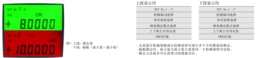 另外,檢測器與顯示器分離的方式,適合用于機械的組立。多種顯示和控制用顯示器可供選擇,具備單一測定、和差演算、峰值對峰值、3段精度顯示等功能可滿足各種測量需求